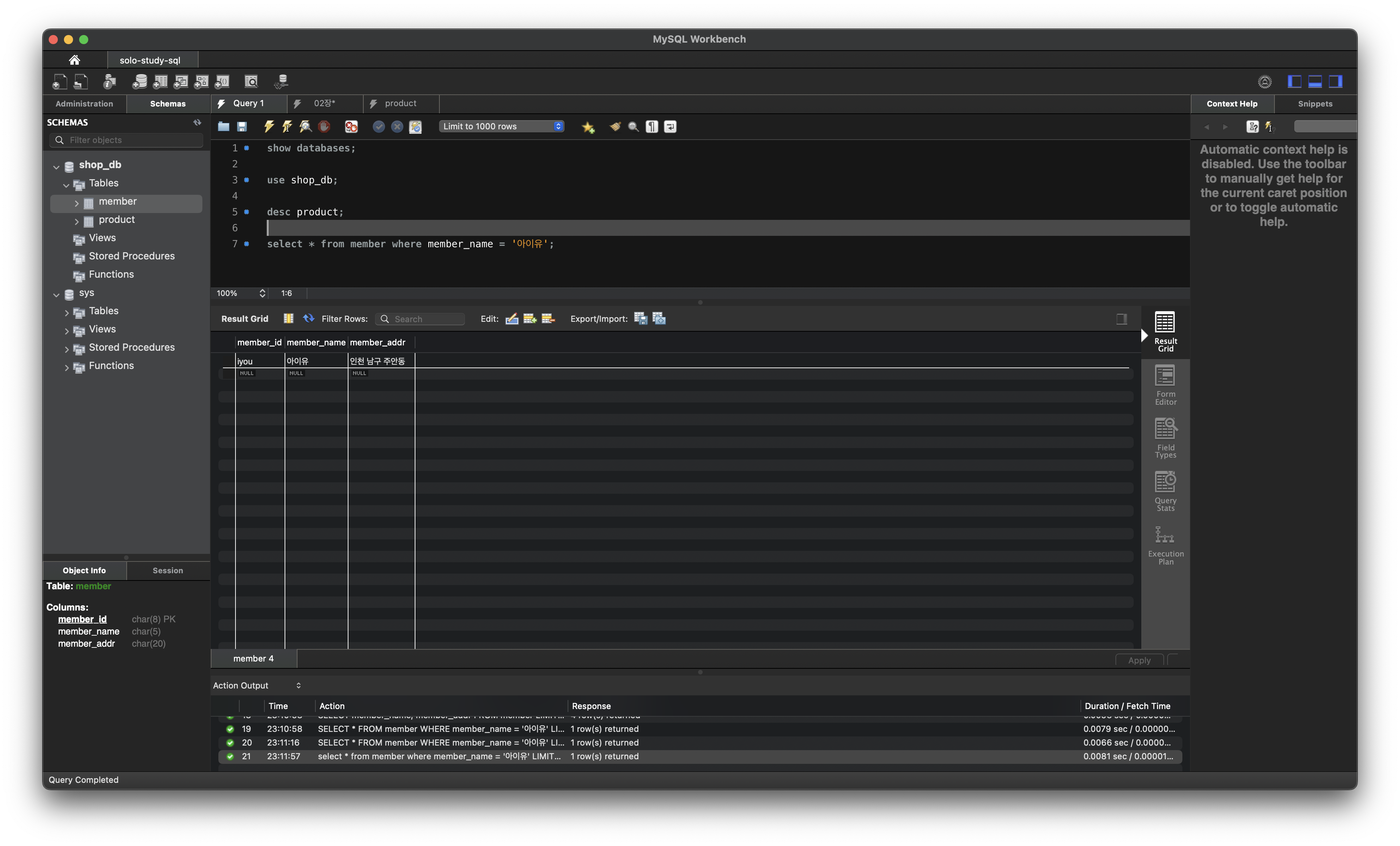 p. 80의 shop_db의 회원 테이블(member)에서 아이유 회원에 대한 정보만 추출한 후 결과 화면 인증하기