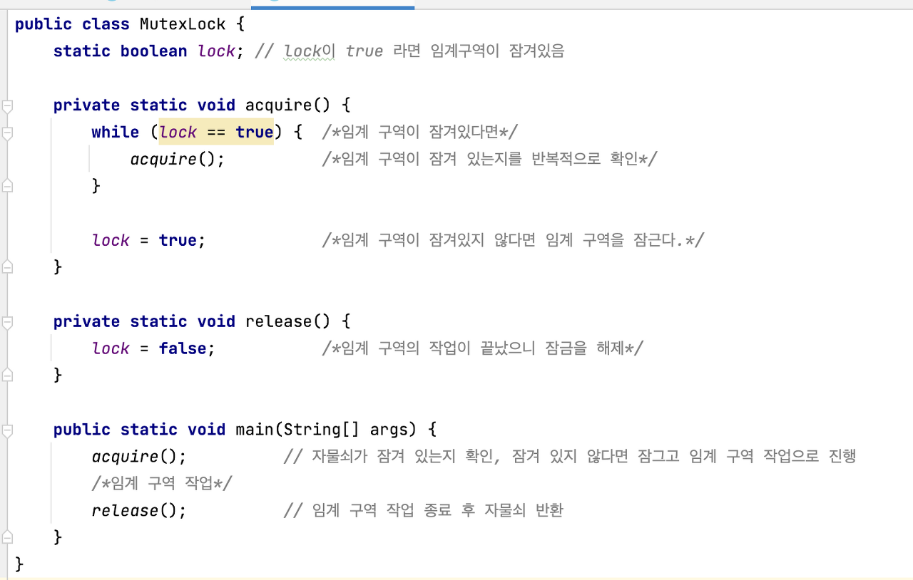 ✅ 바쁜 대기 (busy waiting) : lock이 잠겨있는지 계속 확인해보는 것 ➡️ 좋은 방식은 아님