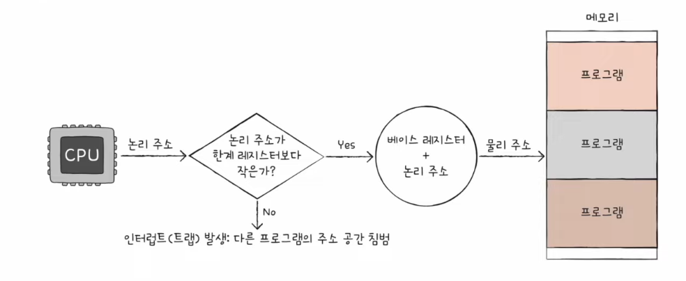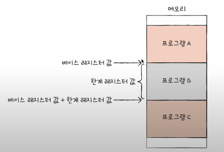 - 베이스 레지스터 값 ≤ 프로그램의 물리 주소 범위 < 베이스 레지스터 + 한계 레지스터 값